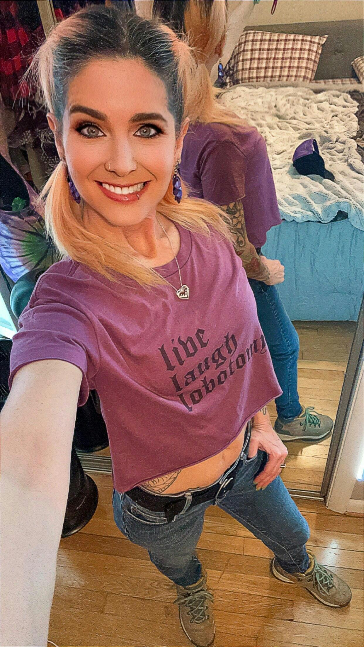 A gothic font women's crop tee featuring the phrase 'live laugh lobotomy'. This edgy top is perfect for those who appreciate dark humor and want to make a bold statement. Ideal for casual wear, music festivals, and alternative fashion enthusiasts.