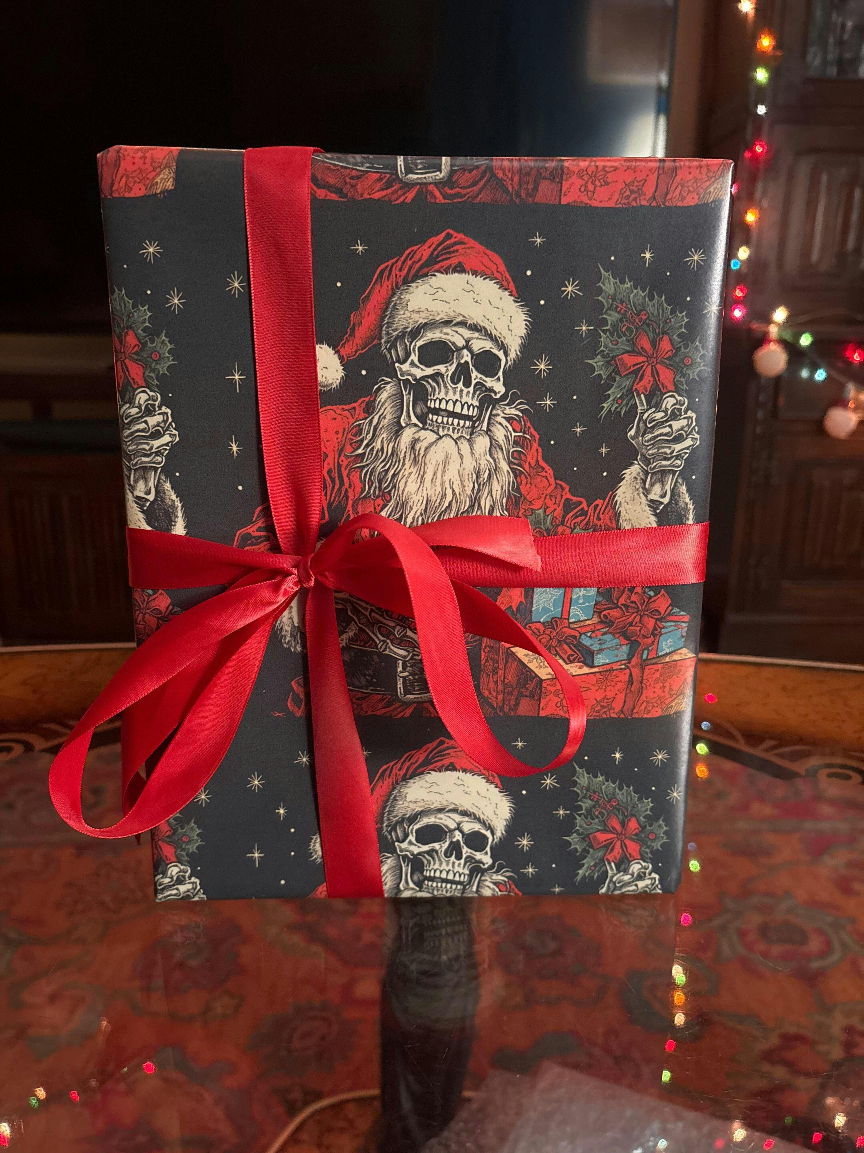 Printed on premium 90gsm fine-art paper, this high-definition design brings eerie elegance to your gift wrapping. Choose between matte or glossy finishes and three convenient sizes to match your macabre holiday spirit.